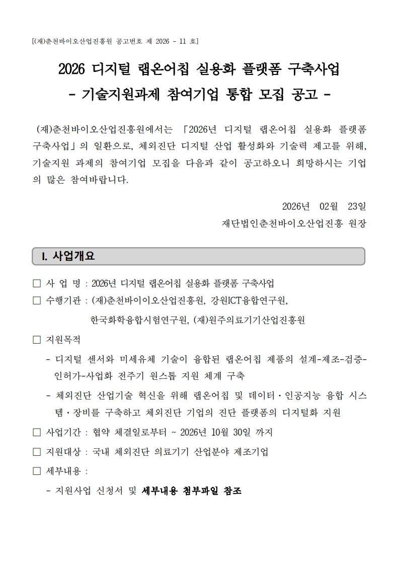 2026년 디지털 랩온어칩 실용화 플랫폼 구축사업 기업지원사업 통합공고문 및 신청서류(3차년) .zip
